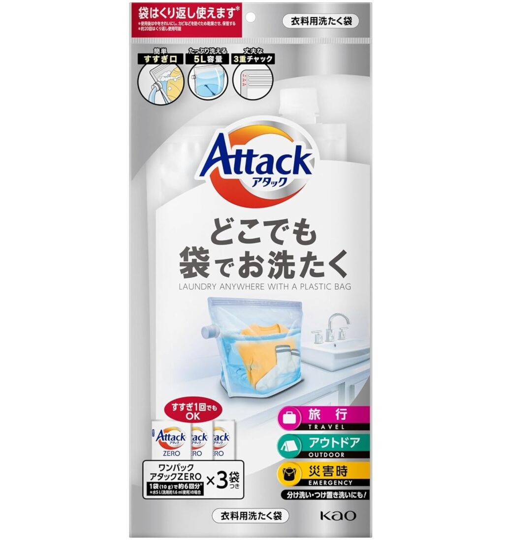 まずは、洗濯機がない場所でも洗濯できる「旅行用洗濯洗剤」。