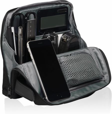 内側には仕切りやメッシュポケットが備わっているので、細かい荷物も固定できます。