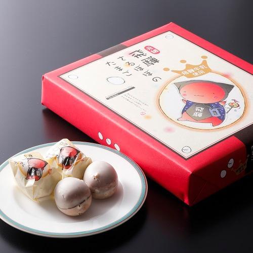 お菓子自体は、黄身餡を卵状のカステラ生地で包み、ホワイトチョコレートでコーティングされたもの。