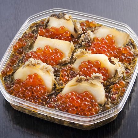めかぶ醤油漬けの上に、柔らかく煮たあわびや濃厚ないくらが贅沢にトッピングされています。