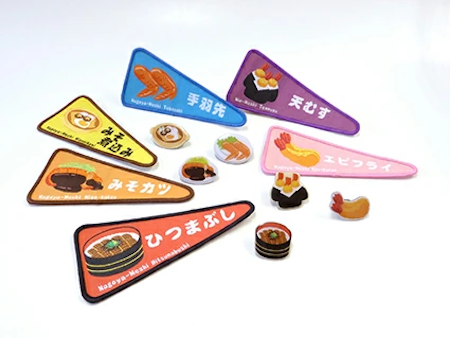 愛知の名物である「天むす」や「ひつまぶし」「みそカツ」「みそ煮込み」が、ピンズとワッペンに描かれています。