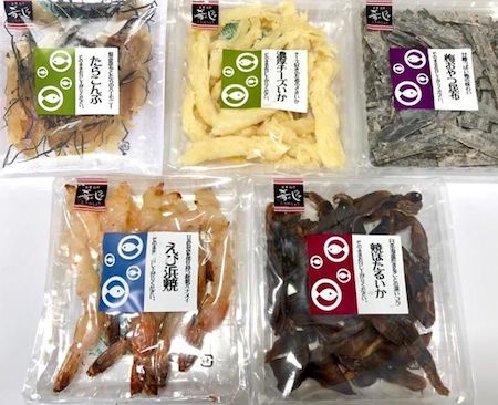 濃厚チーズいか・たらこんぶ・いか足スモーク・さばジャーキー・焼ほたるいか・はたはた浜焼・さわら浜焼・えび浜焼・焼うに・バイ貝の燻製・のどぐろ浜焼・焼塩ふぐなど、種類が豊富なのが魅力◎