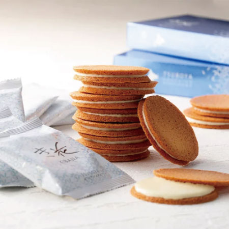 鉄板でじっくりと焼き上げた薄焼きの生地で、ホワイトチョコレートがサンドされています。