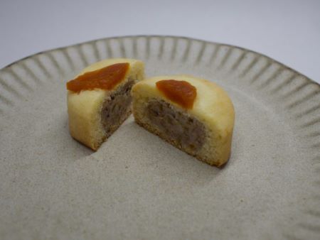 杏や胡桃、松本産のえごまの実などが入った白あんが、ソフトなクッキー生地で包まれた風味豊かな和菓子です。