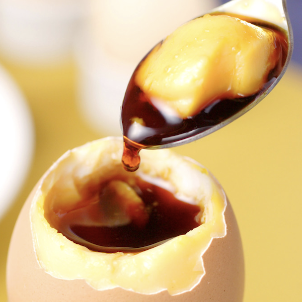 食べ方は、まず生卵を割る容量で卵を割り、スプーンで中のプリンをお皿に取り出します。