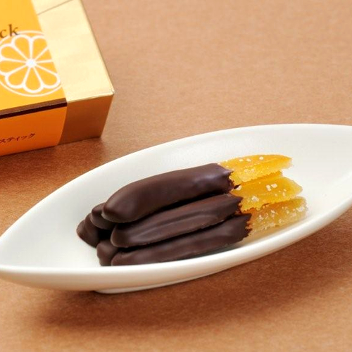 鳴門オレンジの皮を砂糖漬けにし、職人が一本ずつ丁寧にベルギーチョコレートに浸してコーティングしています。