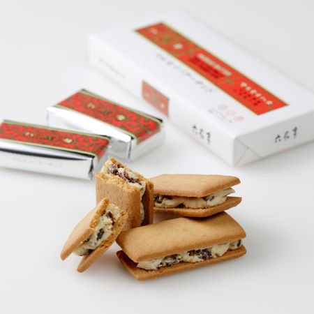 ホワイトチョコレートと北海道産のバター、レーズンが合わさったクリームが、2枚のビスケットに挟まれています。