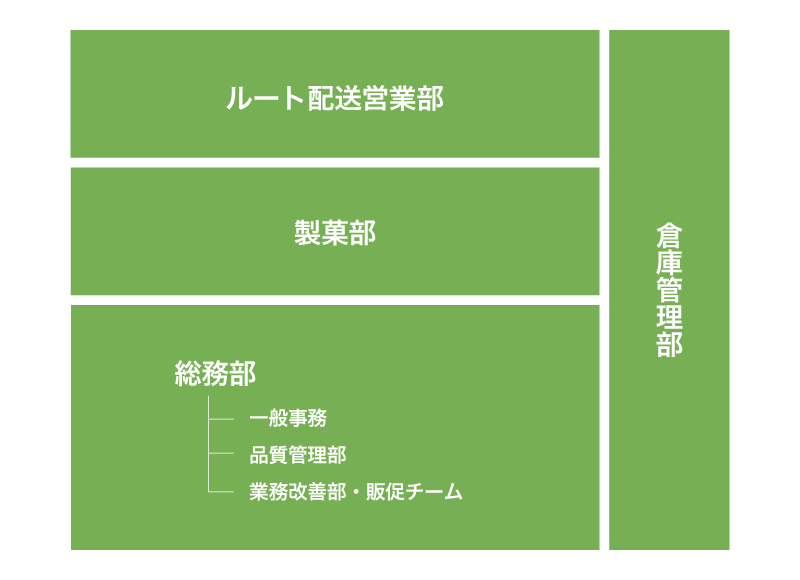 「ルート配送営業部」「製菓部」「総務部」
